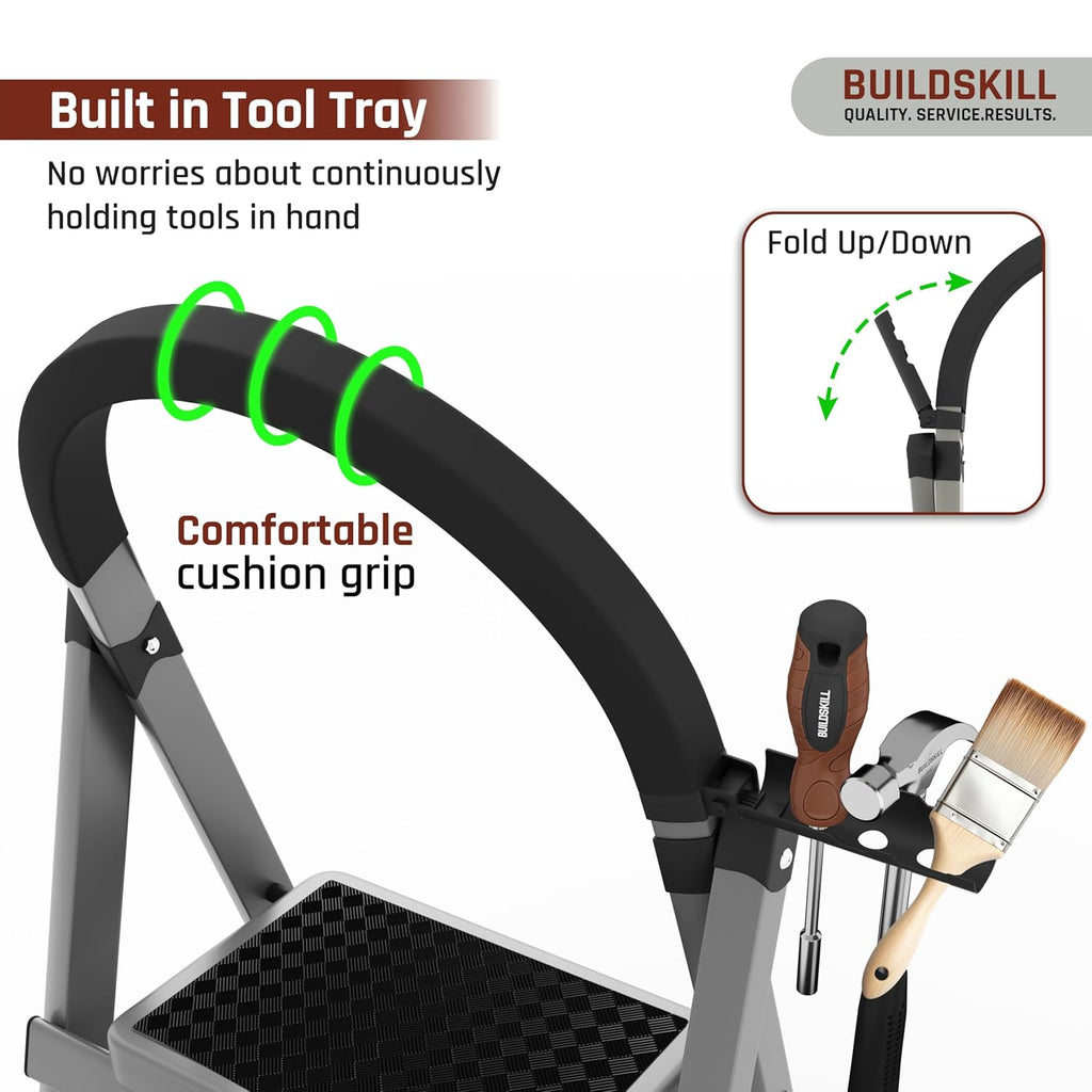 - Wide & Slip-Resistant Platform - Buildskill foldable ladder for home use comes with 20x30cm large checkerboard pattern anti-slip platform for safe footing, equipped with wide rubber-padded feet that offer secured grip, a large contact area and stability while soft rubber padding prevents scratches on any surface making it perfect for tiles, marble, wooden, cemented floors.