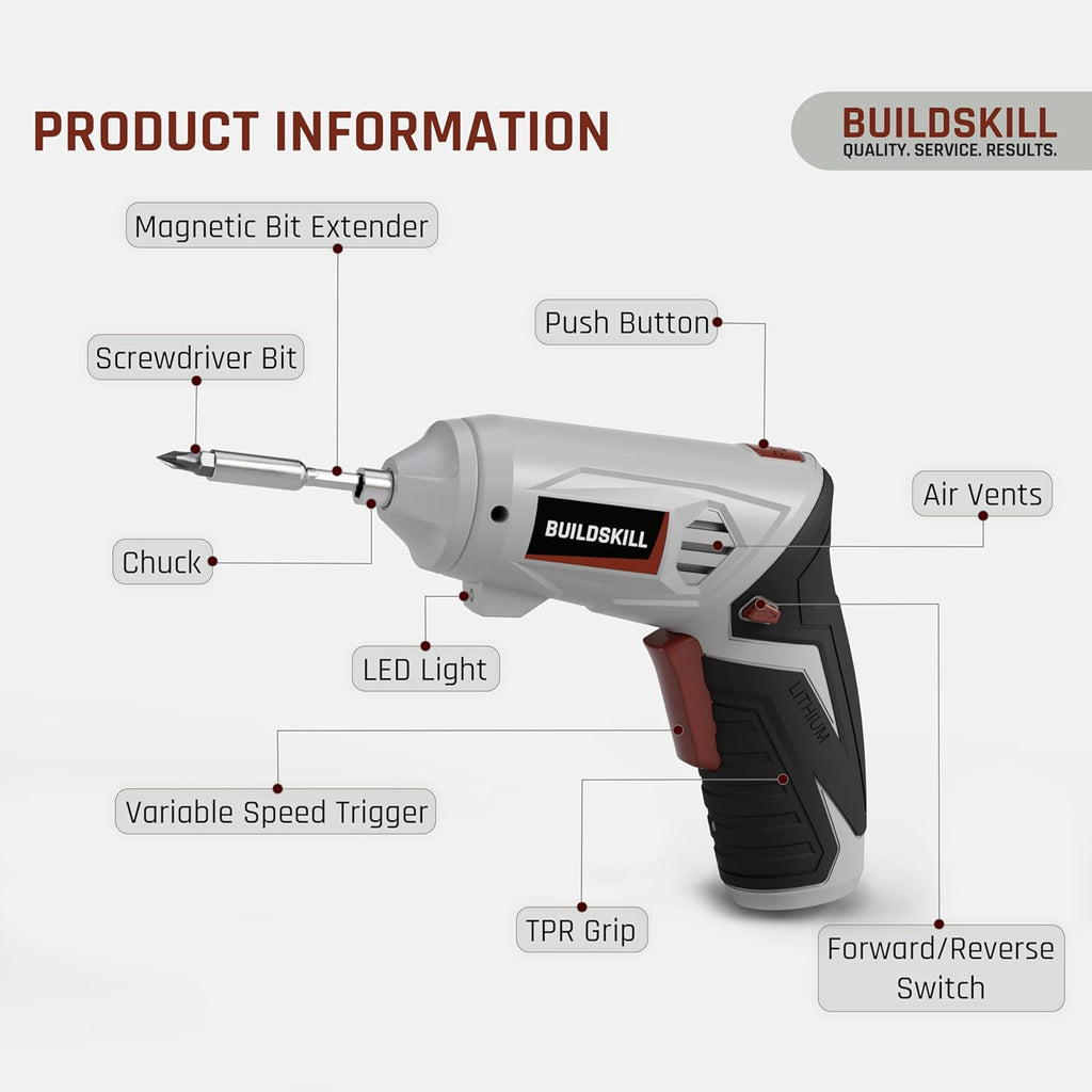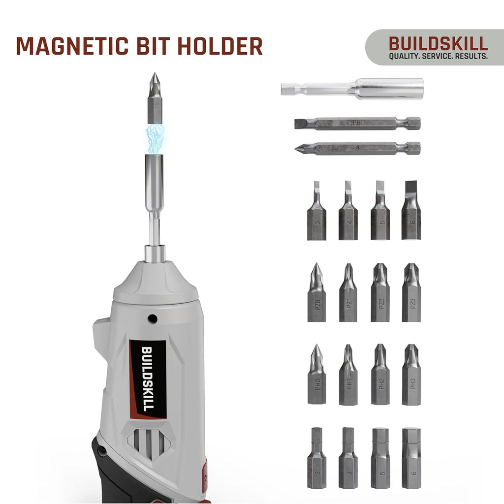 BUILDSKILL 4V Cordless Screw Driver Kit | 19 Pcs | 4 N.M. Torque | 250 RPM | Magnetic Chuck | 1.5AH Battery | Forward-Reverse | 2 position Handle Lock & LED Light | Type-C Charging cable included