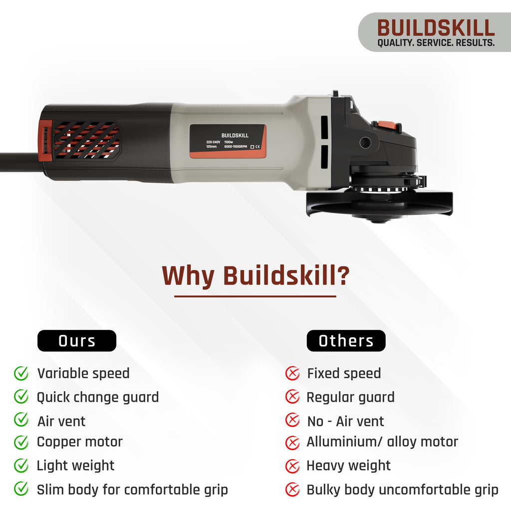 The BUILDSKILL 1100W Angle Grinder is a powerful tool for grinding, cutting, and polishing with an 1100W copper motor delivering speeds of 6000-11,000 RPM. Featuring a 125mm disc, it easily handles materials like metal, tile, and concrete. The grinder offers variable speed control, a forward/reverse switch, and a 2-position auxiliary handle for comfort and control. A quick-change guard system allows for tool-free adjustments, while the adjustable safety guard ensures user protection. Backed by a 6-month warranty, this angle grinder is perfect for both professionals and DIYers.