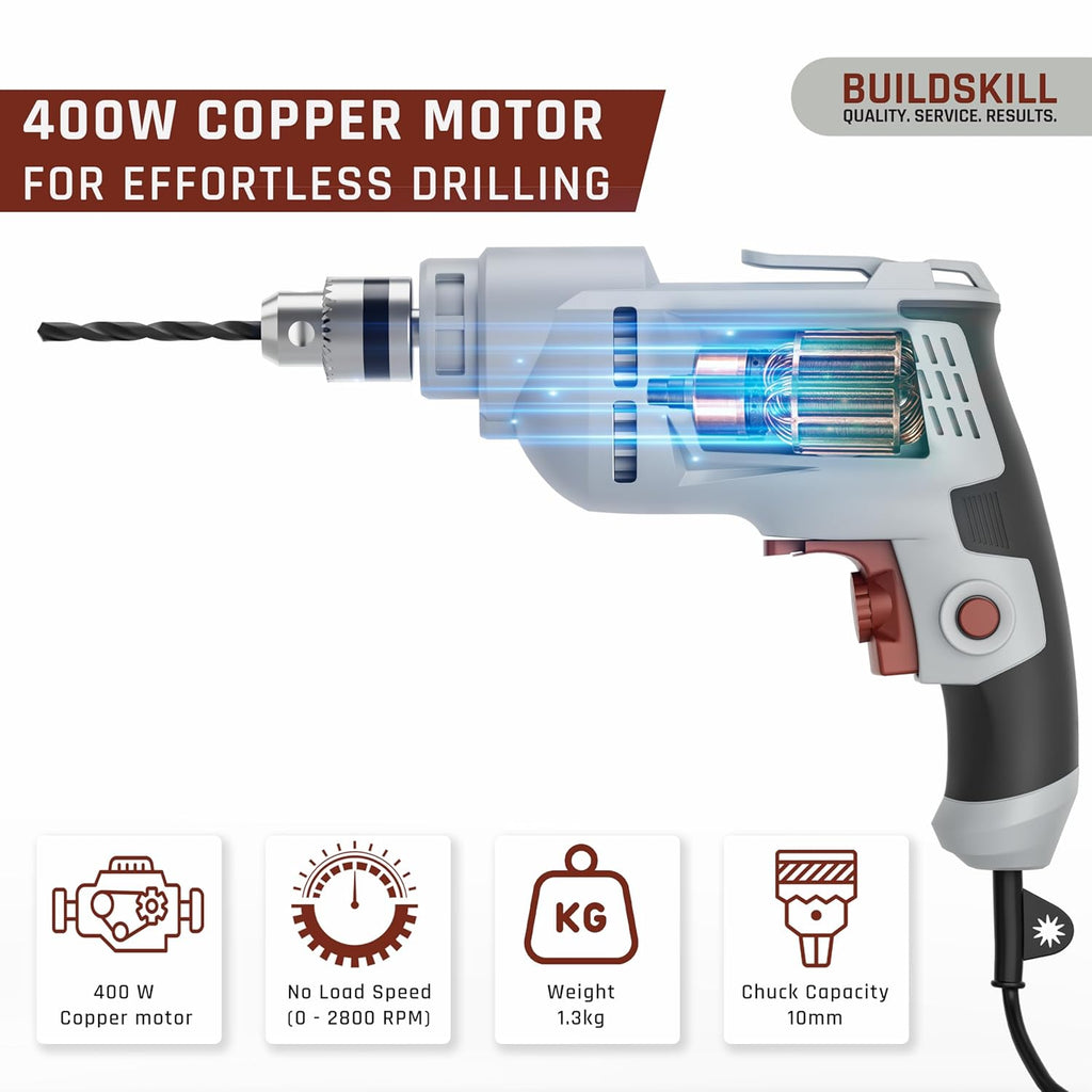 - Corded and Powerful 400W Electric Drill Machine: This corded electric drill machine is equipped with a durable 400W copper motor that delivers strong and stable performance for smooth and efficient drilling on wood, metal, and aluminium surfaces. Operating on a rated voltage of 220V–240V and 50Hz frequency, it delivers reliable, consistent power for both home and professional use.