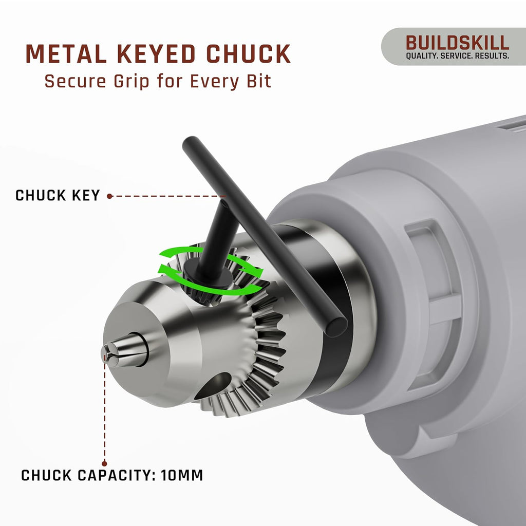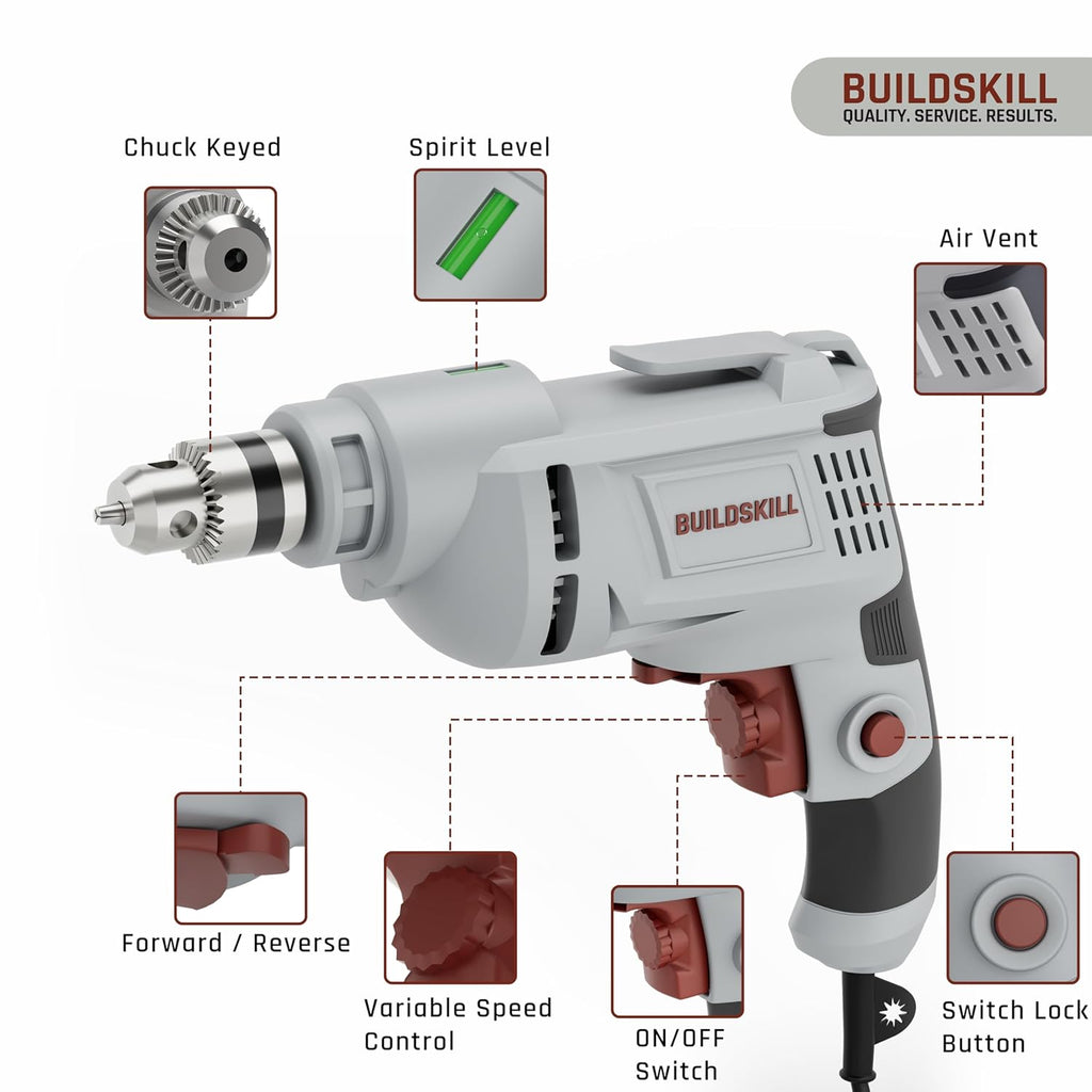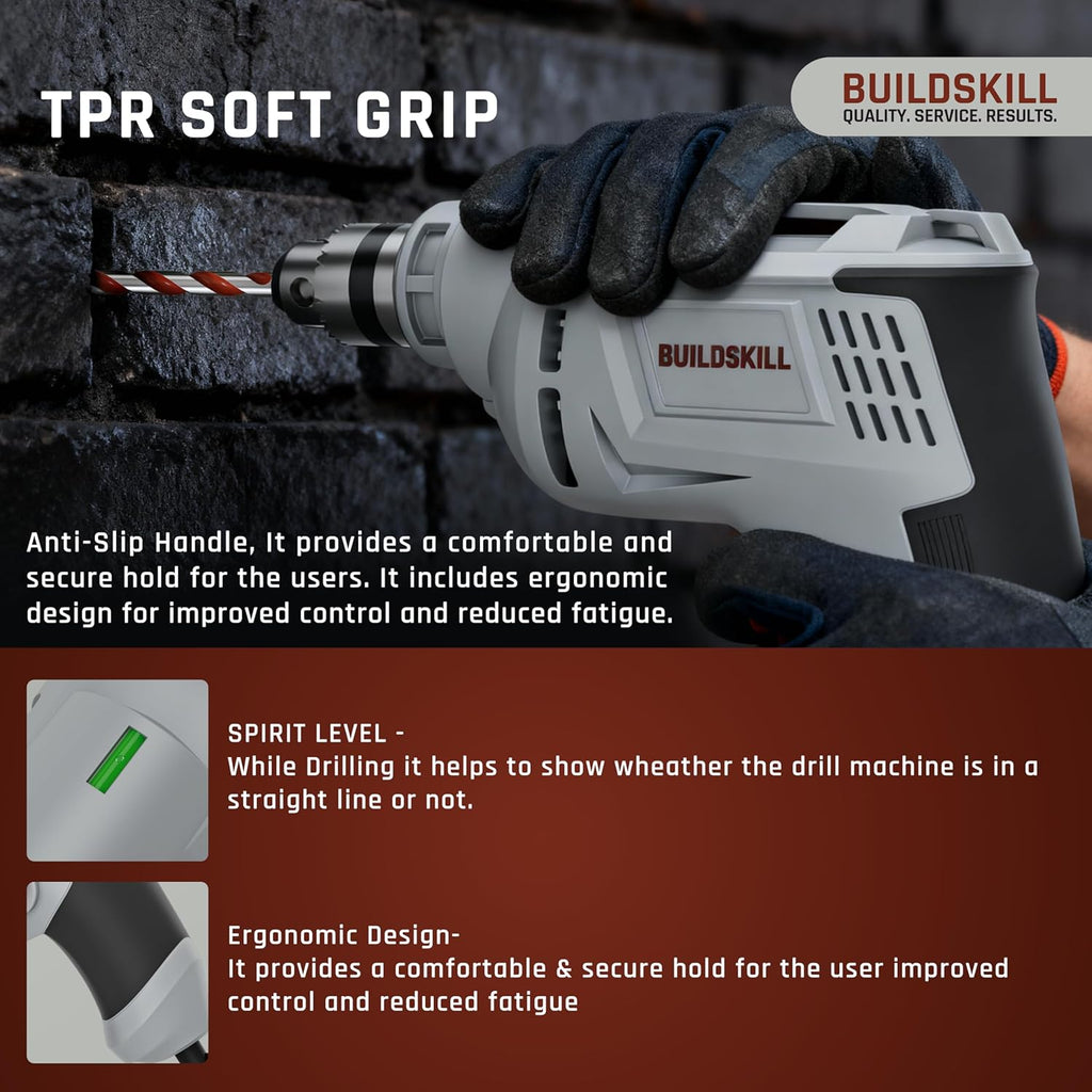 - 7 Drill Bits Set for Multipurpose Use: Buildskill drill machine comes with 7 drill bits set includes 3 HSS bits 3/5/6MM for metal, 3 wood bits 3/5/6MM for furniture or fixtures, and 1 multipurpose 6MM bit, giving you all the tools you need in one kit. The included bits make the drill machine ready to use for wall fittings, repairs, and assembly work right out of the box.