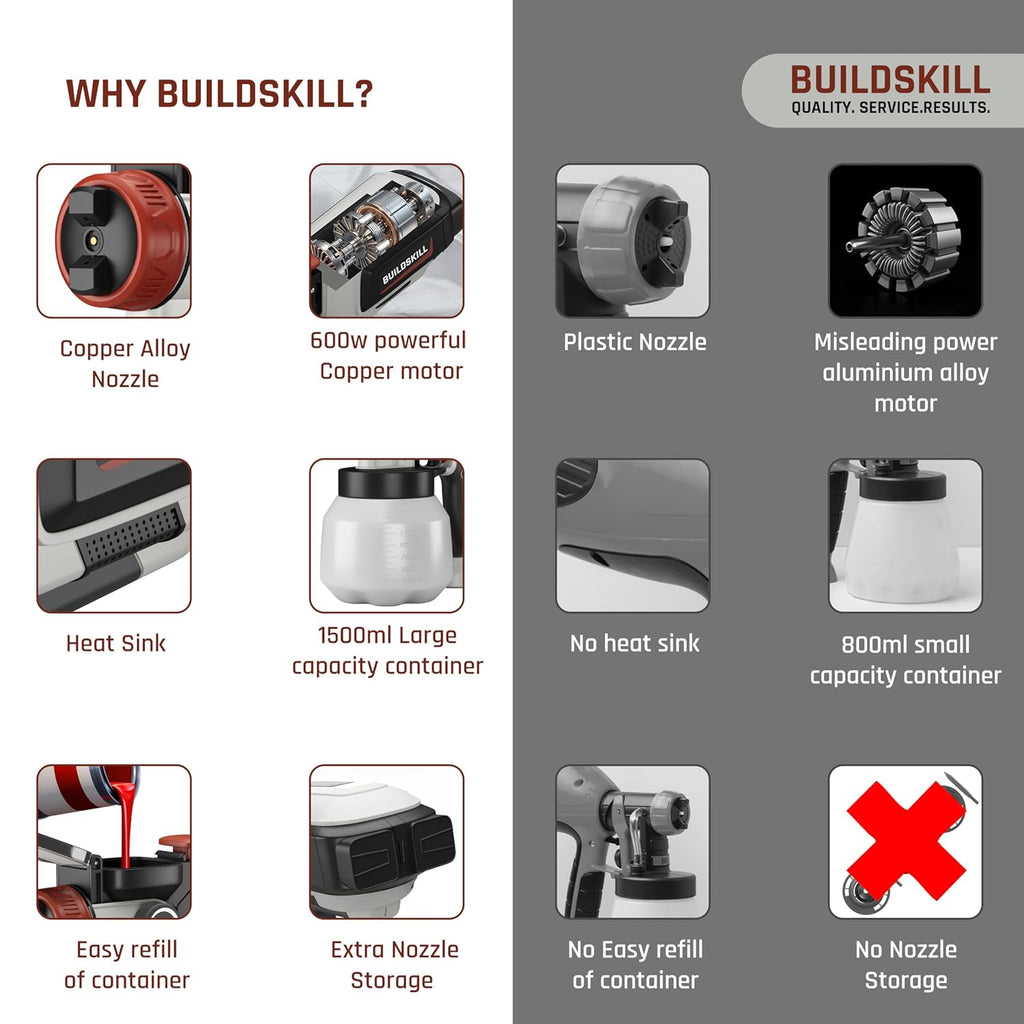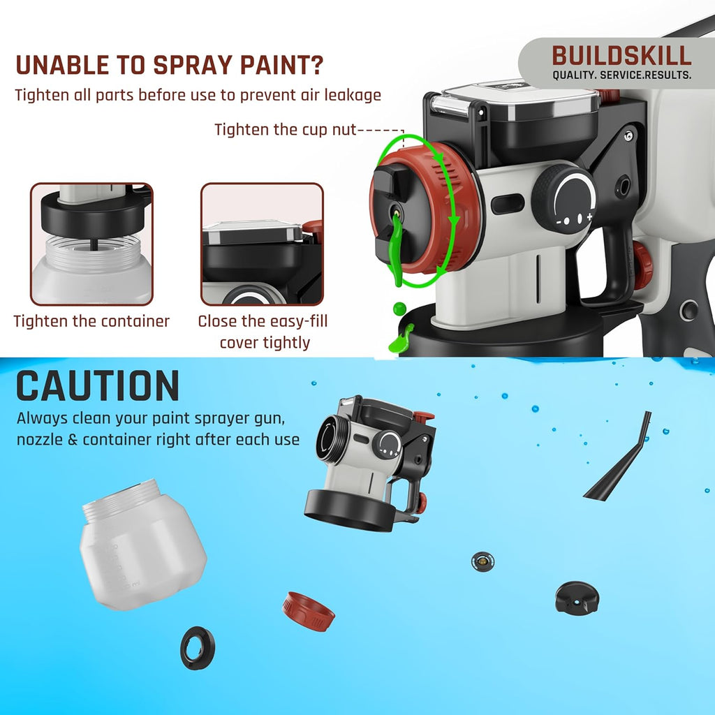 - 1500ml Large Capacity Container - The Buildskill spray paint machine for home comes with a 1500ml large paint container, making it perfect for painting large surface areas without interruptions. This paint sprayer significantly increases efficiency, up to three times that of traditional rollers and brushes. Whether you're painting outdoors, indoors, cabinets, or walls, this paint sprayer machine for home & professional use saves you time and effort.