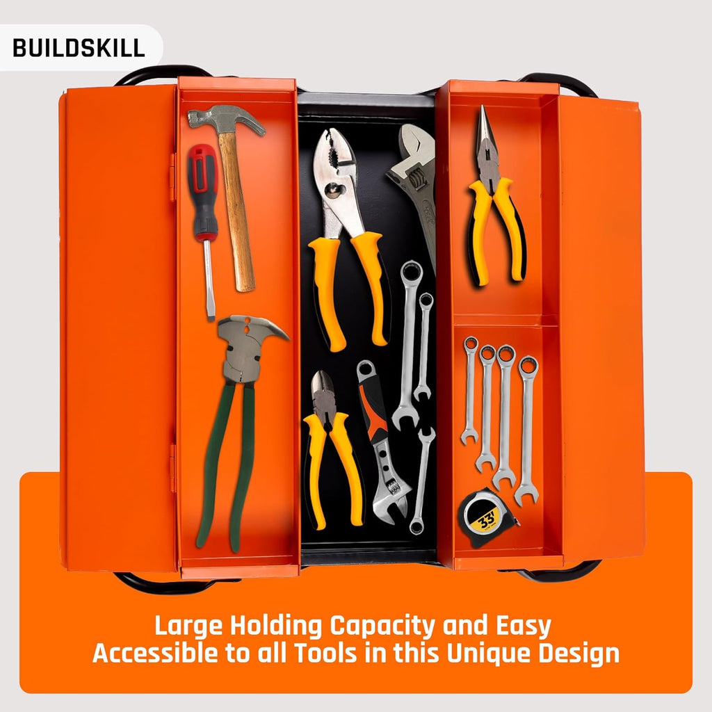 The Buildskill Metal Toolbox 21"- 3 Cabinets is the epitome of home organiser items and storage solutions. This toolbox offers an expansive store capacity while retaining a lightweight design for ease of handling. Each compartment box whispers quality, featuring superb metal construction and a seamless powder coating that promises durability and a sleek finish.