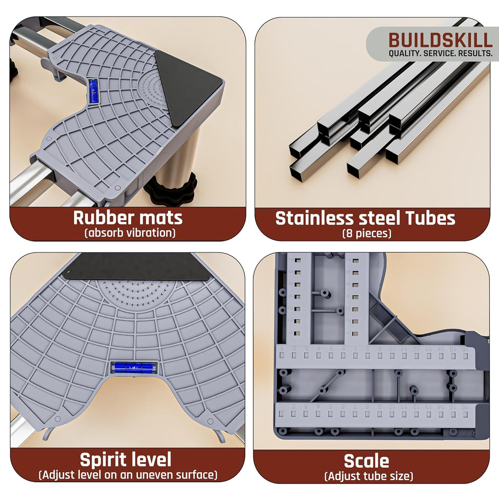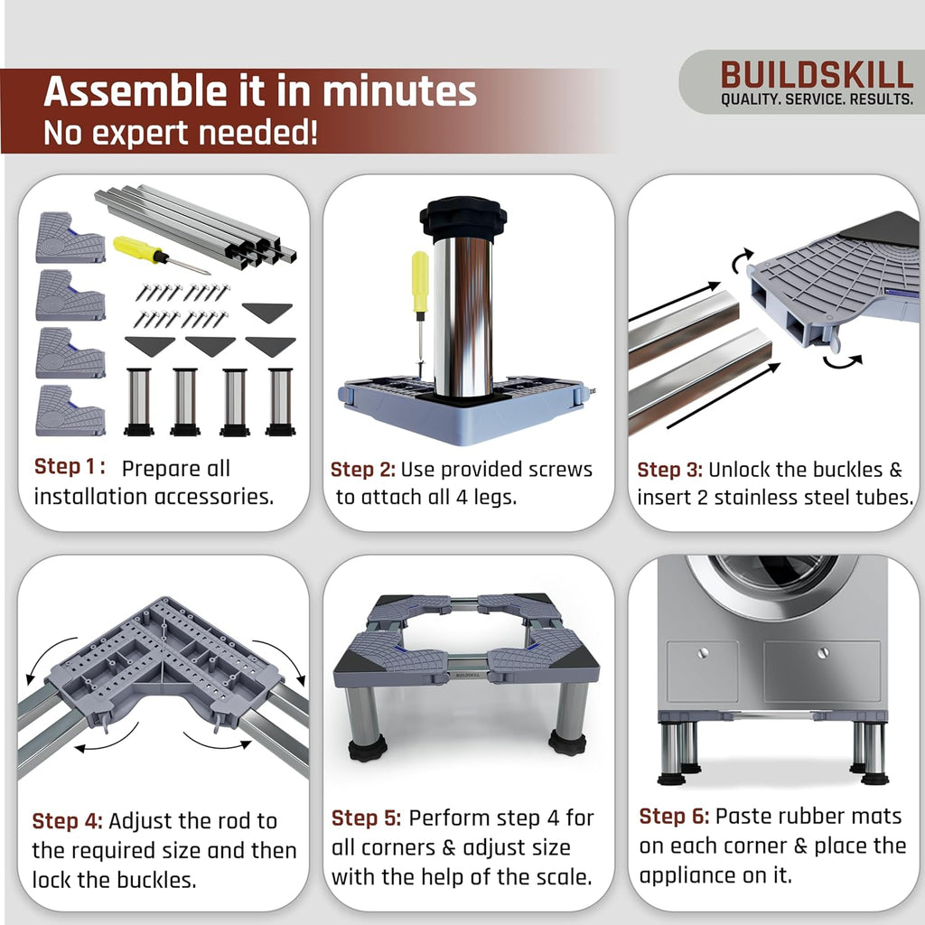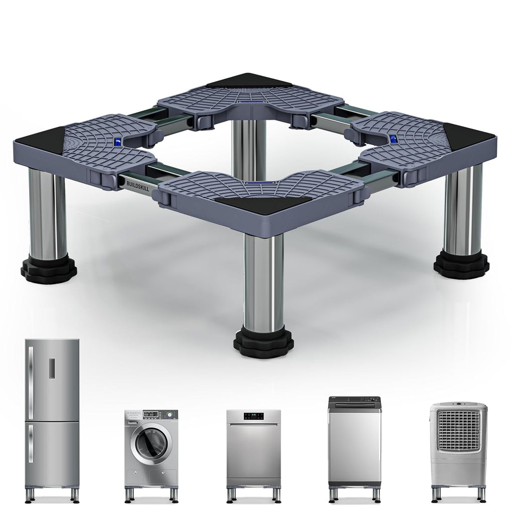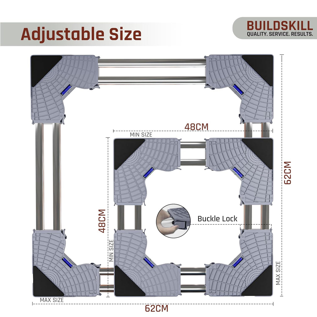 - Adjustable Base Size - The Buildskill washing machine stand adjustable size is designed with a universal base that fits appliances from 48cm x 48cm up to 62cm x 62cm. Equipped with a buckle lock system to keep your washing machine, refrigerator, or dishwasher stable, while the inbuilt measuring scale ensures accurate adjustments. Perfect for top load washing machine stand, front load washing machine stand 7kg, washing machine stand 8kg, fridge stand for single door, fridge stand for double door, dishwasher stand, etc.